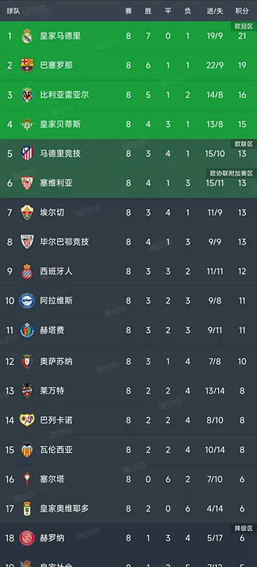 北京时间10月6日,西甲第8轮比赛全部结束。在这轮比赛中,巴塞罗那1-4惨败给塞维利亚,西班牙人1-2不敌皇家贝蒂斯,皇家社会0-1负于巴列卡诺,而塞尔塔与马德里竞技的比赛以1-1收场。现在让我们来看一下最新的西甲积分榜吧!